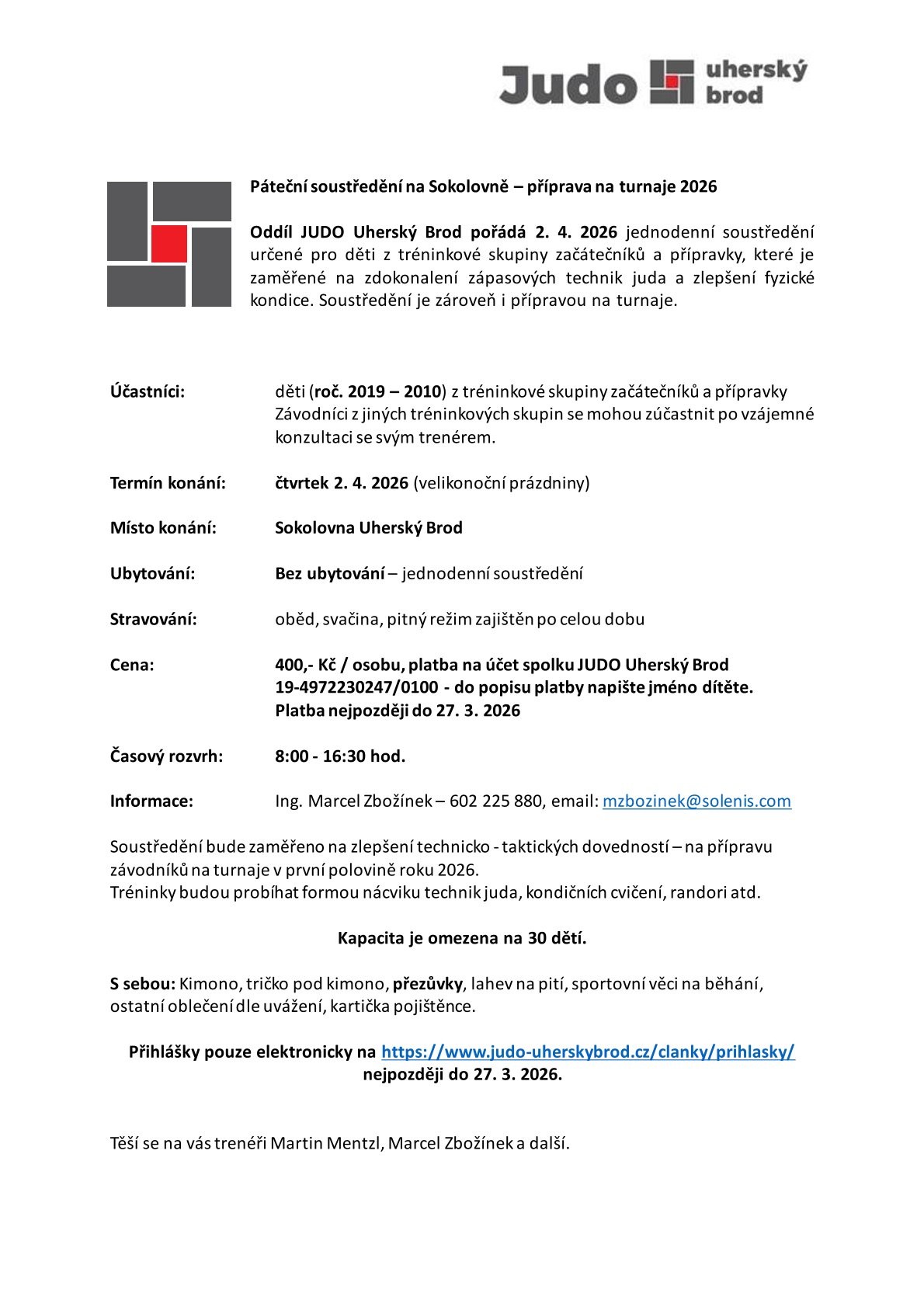 Přihlášky a platby nejpozději do 27. 3. 2026. Přihlašování ZDE.