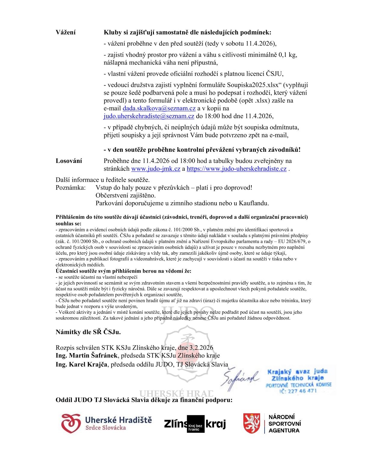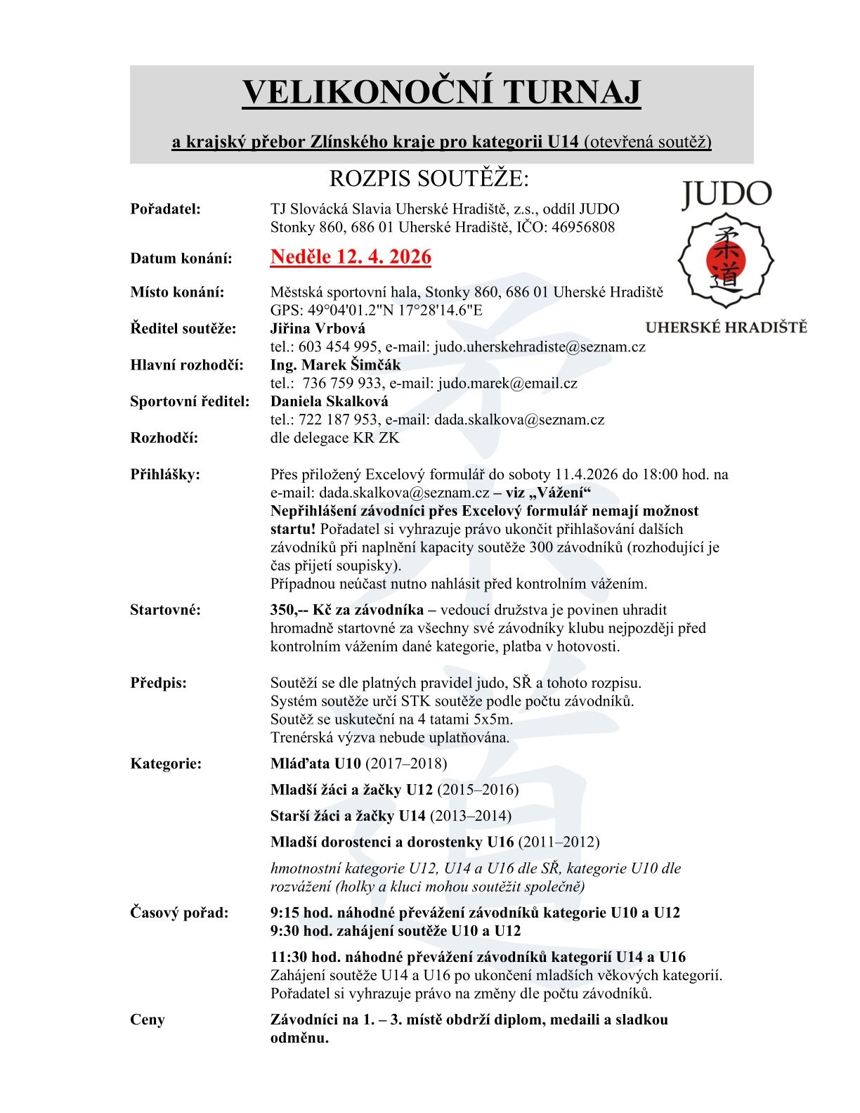 V neděli 12. 4. 2026 nás čeká turnaj v UH. Startují zde kategorie U10 – U16, pro kategorii U14 se jedná o krajský přebor. Startují pouze nominovaní závodníci ze skupin PŘÍPRAVKA ST., POKORČILÍ a ZÁVOĎÁCI ML. & ST. Nominace obdrží závodníci na trénincích nebo ve skupinách.