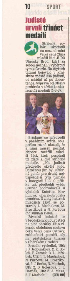 Ostrava opět nezklamala. Bohatá účast judistů z 5 zemí v počtu 585 závodníků vyšvihla výkonnostní laťku opravdu vysoko. Na zisk medailí tentokrát museli všichni opravdu máknout. Silná účast zajistila všem bohatou porci zápasů, takže zisk medailí rozhodně nebyl samozřejmostí. Přesto 17členná výprava přivezla skvělých 13 medailí (4-3-6), což JUDO Uherský Brod katapultovalo na 6. místo mezi neúspěšnějšími kluby turnaje, kterých bylo celkem 64.